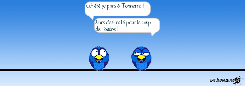 Case 1: Case 2:Bird 1: Cet été je pars à Tonnerre !Bird 2: Alors c'est raté pour le coup de foudre ! Case 3: