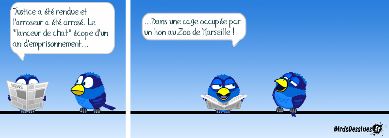 Case 1:Bird 1: Justice a été rendue et l'arroseur a été arrosé. Le "lanceur de chat" écope d'un an d'emprisonnement... Case 2:Bird 1: ...Dans une cage occupée par un lion au Zoo de Marseille ! Case 3: