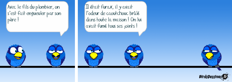 Case 1:Bird 1: Avec le fils du plombier, on s’est fait engueuler par son père ! Case 2:Bird 1: Il était furax, il y avait l’odeur de caoutchouc brûlé dans toute la maison ! On lui avait fumé tous ses joints ! Case 3: