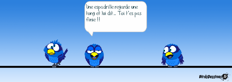 Case 1: Case 2:Bird 1: Une espadrille regarde une tong et lui dit… Toi t’es pas finie !! Case 3: