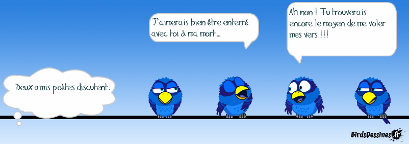 Case 1: Case 2:Bird 1: J’aimerais bien être enterré avec toi à ma mort… Case 3:Bird 1: Ah non ! Tu trouverais encore le moyen de me voler mes vers !!!