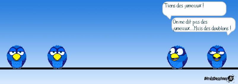 Case 1: Case 2: Case 3:Bird 1: Tiens des jumeaux !Bird 2: On ne dit pas des jumeaux...Mais des doublons !