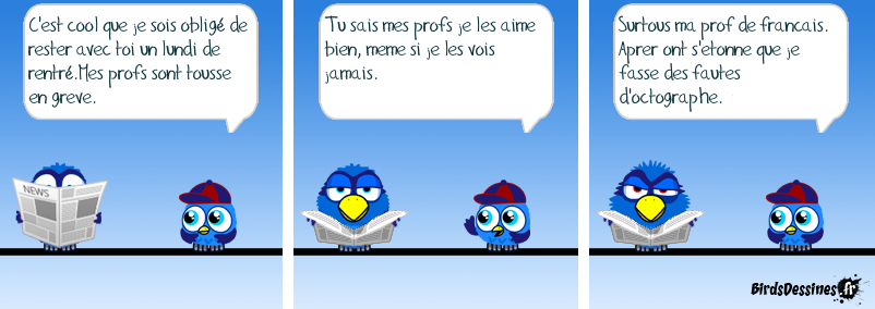 Case 1:Bird 1: C'est cool que je sois obligé de rester avec toi un lundi de rentré.Mes profs sont tousse en greve. Case 2:Bird 1: Tu sais mes profs je les aime bien, meme si je les vois jamais. Case 3:Bird 1: Surtous ma prof de francais. Aprer ont s'etonne que je fasse des fautes d'octographe.