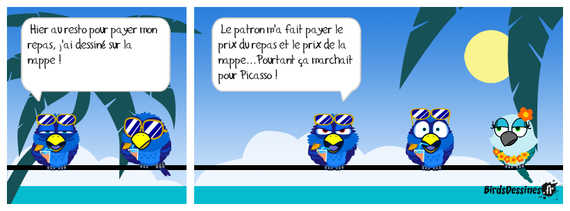 Case 1:Bird 1: Hier au resto pour payer mon repas, j'ai dessiné sur la nappe ! | Case 2: Bird 1: Le patron m'a fait payer le prix du repas et le prix de la nappe...Pourtant ça marchait pour Picasso ! | Case 3: