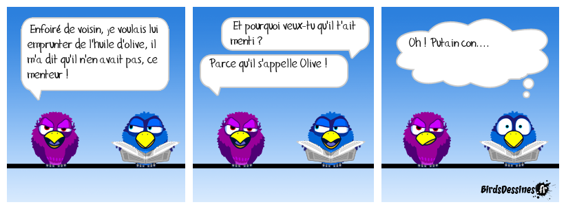 Case 1:Bird 1: Enfoiré de voisin, je voulais lui emprunter de l'huile d'olive, il m'a dit qu'il n'en avait pas, ce menteur ! | Case 2: Bird 1: Et pourquoi veux-tu qu'il t'ait menti ? Bird 2: Parce qu'il s'appelle Olive ! | Case 3: Bird 1: Oh ! Putain con.... Bird 2: Parce qu'il s'appelle Olive !