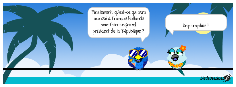 Case 1:Bird 1: Finalement, qu'est-ce qui aura manqué à François Hollande pour faire un grand président de la République ? | Case 2: Bird 1: Finalement, qu'est-ce qui aura manqué à François Hollande pour faire un grand président de la République ? | Case 3: Bird 1: Un parapluie !