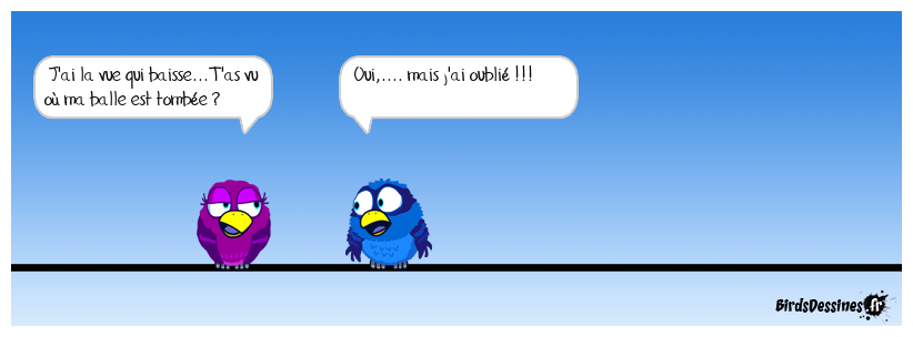 Case 1:Bird 1: J'ai la vue qui baisse...T'as vu où ma balle est tombée ? | Case 2: Bird 1: Oui,.... mais j'ai oublié !!! | Case 3: