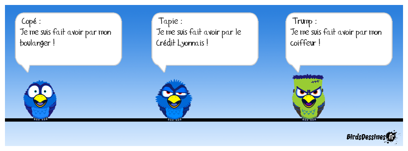 Case 1:Bird 1: Copé : Je me suis fait avoir par mon boulanger ! | Case 2: Bird 1: Tapie : Je me suis fait avoir par le Crédit Lyonnais ! | Case 3: Bird 1: Trump : Je me suis fait avoir par mon coiffeur !