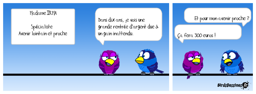 Case 1:Bird 1: Madame IRMA Spécialiste Avenir lointain et proche | Case 2: Bird 1: Dans dix ans, je vois une grande rentrée d'argent due à un gain inattendu. | Case 3: Bird 1: Et pour mon avenir proche ? Bird 2: Ça fera 300 euros !