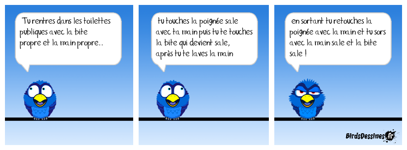 Case 1:Bird 1: Tu rentres dans les toilettes publiques avec la bite propre et la main propre.. | Case 2: Bird 1: tu touches la poignée sale avec ta main puis tu te touches la bite qui devient sale, après tu te laves la main | Case 3: Bird 1: en sortant tu retouches la poignée avec la main et tu sors avec la main sale et la bite sale !