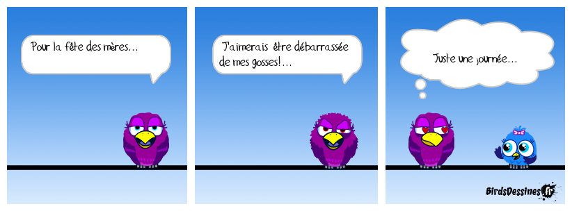 Case 1:Bird 1: Pour la fête des mères... | Case 2: Bird 1: J'aimerais être débarrassée de mes gosses!... | Case 3: Bird 1: Juste une journée...