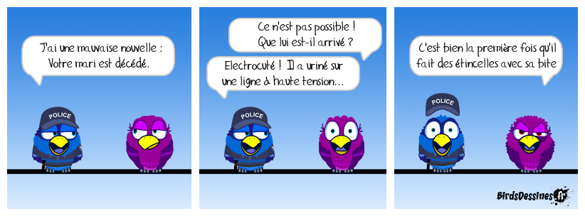 Case 1:Bird 1: J'ai une mauvaise nouvelle : Votre mari est décédé. | Case 2: Bird 1: Ce n'est pas possible ! Que lui est-il arrivé ? Bird 2: Electrocuté ! Il a uriné sur une ligne à haute tension... | Case 3: Bird 1: C'est bien la première fois qu'il fait des étincelles avec sa bite