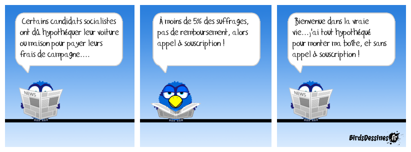 Case 1:Bird 1: Certains candidats socialistes ont dû hypothéquer leur voiture ou maison pour payer leurs frais de campagne.... | Case 2: Bird 1: À moins de 5% des suffrages, pas de remboursement, alors appel à souscription ! | Case 3: Bird 1: Bienvenue dans la vraie vie...j'ai tout hypothéqué pour monter ma boïte, et sans appel à souscription !