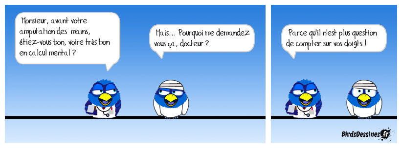 Case 1:Bird 1: Monsieur, avant votre amputation des mains, étiez-vous bon, voire très bon en calcul mental ? | Case 2: Bird 1: Mais... Pourquoi me demandez vous ça, docteur ? | Case 3: Bird 1: Parce qu'il n'est plus question de compter sur vos doigts !