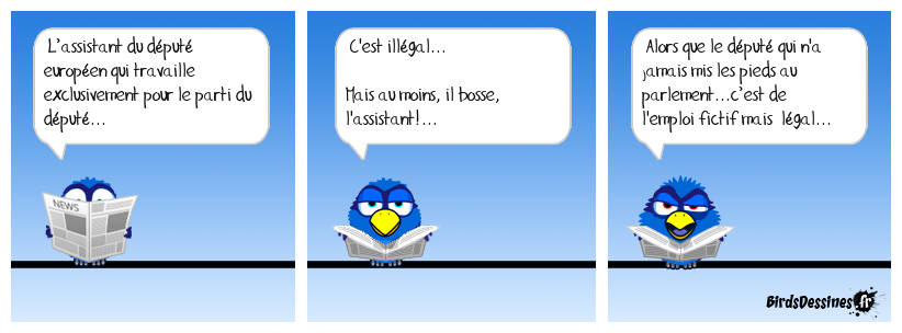 Case 1:Bird 1: L’assistant du député européen qui travaille exclusivement pour le parti du député... | Case 2: Bird 1: C'est illégal... Mais au moins, il bosse, l'assistant!... | Case 3: Bird 1: Alors que le député qui n'a jamais mis les pieds au parlement...c’est de l'emploi fictif mais légal...