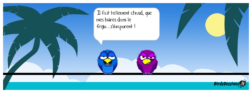 Case 1: | Case 2: Bird 1: Il fait tellement chaud, que mes bières dans le frigo...s'évaporent ! | Case 3: