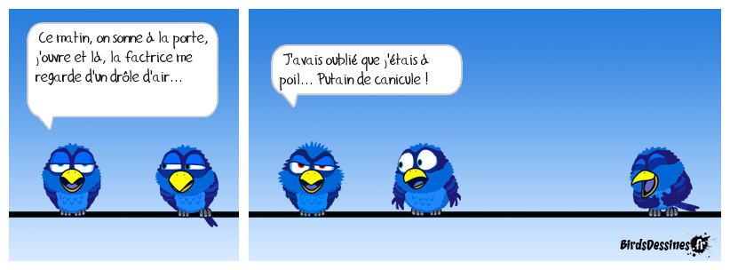 Case 1:Bird 1: Ce matin, on sonne à la porte, j'ouvre et là, la factrice me regarde d'un drôle d'air... | Case 2: Bird 1: J'avais oublié que j'étais à poil... Putain de canicule ! | Case 3:
