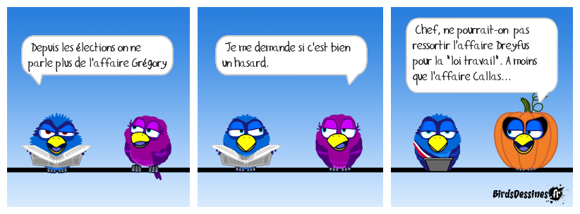 Case 1:Bird 1: Depuis les élections on ne parle plus de l'affaire Grégory | Case 2: Bird 1: Je me demande si c'est bien un hasard. | Case 3: Bird 1: Chef, ne pourrait-on pas ressortir l'affaire Dreyfus pour la "loi travail". A moins que l'affaire Callas...