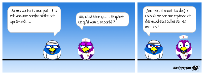 Case 1:Bird 1: Je suis content, mon petit fils est venu me rendre visite cet après-midi.... | Case 2: Bird 1: Ah, c'est bien ça.... Et qu'est ce qu'il vous a raconté ? | Case 3: Bird 1: Ben rien, il avait les doigts coincés sur son smartphone et des écouteurs collés sur les oreilles !