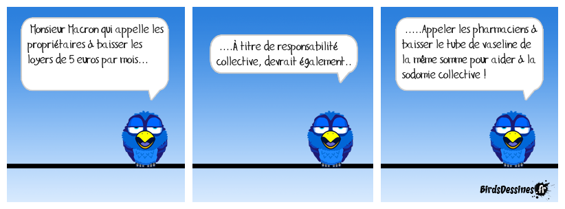 Case 1:Bird 1: Monsieur Macron qui appelle les propriétaires à baisser les loyers de 5 euros par mois... | Case 2: Bird 1: ....À titre de responsabilité collective, devrait également.. | Case 3: Bird 1: .....Appeler les pharmaciens à baisser le tube de vaseline de la même somme pour aider à la sodomie collective !