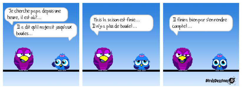 Case 1:Bird 1: Je cherche papa depuis une heure, il est où?...Bird 2: Il a dit qu'il nageait jusqu'aux bouées... | Case 2: Bird 1: Mais la saison est finie... Il n'y a plus de bouée!... | Case 3: Bird 1: Il finira bien par s'en rendre compte!...