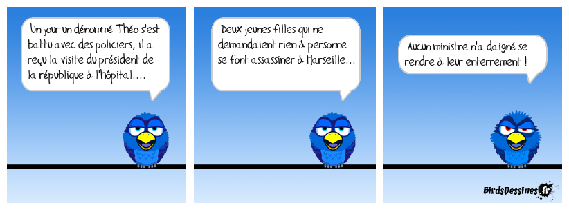 Case 1:Bird 1: Un jour un dénommé Théo s'est battu avec des policiers, il a reçu la visite du président de la république à l'hôpital.... | Case 2: Bird 1: Deux jeunes filles qui ne demandaient rien à personne se font assassiner à Marseille... | Case 3: Bird 1: Aucun ministre n'a daigné se rendre à leur enterrement !