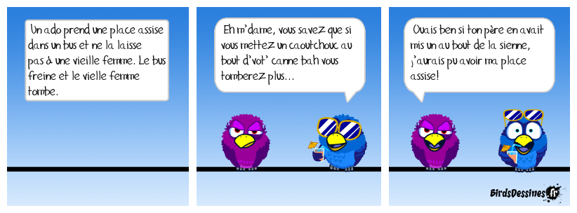 Case 1:Bird 1: Un ado prend une place assise dans un bus et ne la laisse pas à une vieille femme. Le bus freine et le vielle femme tombe. | Case 2: Bird 1: Eh m’dame, vous savez que si vous mettez un caoutchouc au bout d’vot’ canne bah vous tomberez plus... | Case 3: Bird 1: Ouais ben si ton père en avait mis un au bout de la sienne, j’aurais pu avoir ma place assise!