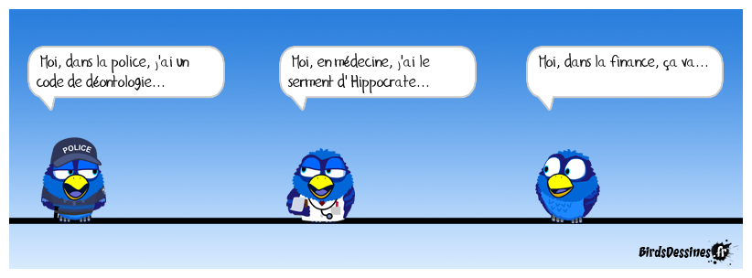 Case 1:Bird 1: Moi, dans la police, j'ai un code de déontologie... | Case 2: Bird 1: Moi, en médecine, j'ai le serment d' Hippocrate... | Case 3: Bird 1: Moi, dans la finance, ça va...