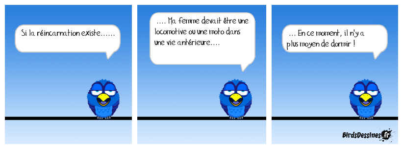 Case 1:Bird 1: Si la réincarnation existe...... | Case 2: Bird 1: .... Ma femme devait être une locomotive ou une moto dans une vie antérieure.... | Case 3: Bird 1: ... En ce moment, il n'y a plus moyen de dormir !