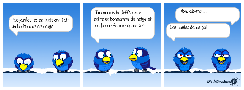 Case 1:Bird 1: Regarde, les enfants ont fait un bonhomme de neige... | Case 2: Bird 1: Tu connais la différence entre un bonhomme de neige et une bonne femme de neige? | Case 3: Bird 1: Non, dis-moi... Bird 2: Les boules de neige!