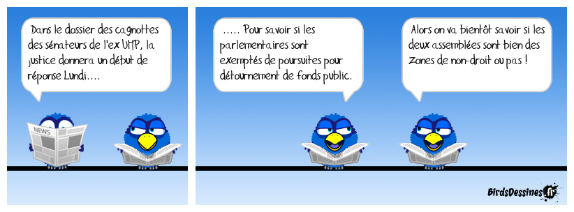 Case 1:Bird 1: Dans le dossier des cagnottes des sénateurs de l'ex UMP, la justice donnera un début de réponse Lundi.... | Case 2: Bird 1: ..... Pour savoir si les parlementaires sont exemptés de poursuites pour détournement de fonds public. | Case 3: Bird 1: Alors on va bientôt savoir si les deux assemblées sont bien des zones de non-droit ou pas !
