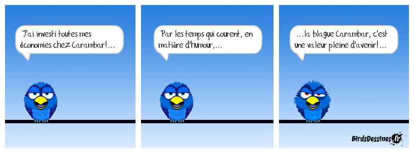 Case 1:Bird 1: J'ai investi toutes mes économies chez Carambar!... | Case 2: Bird 1: Par les temps qui courent, en matière d'humour,... | Case 3: Bird 1: ...la blague Carambar, c'est une valeur pleine d'avenir!...