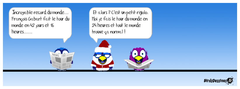 Case 1:Bird 1: Incroyable record du monde... François Gabart fait le tour du monde en 42 jours et 16 heures...... | Case 2: Bird 1: Et alors ? C'est un petit rigolo. Moi je fais le tour du monde en 24 heures et tout le monde trouve ça normal ! | Case 3:
