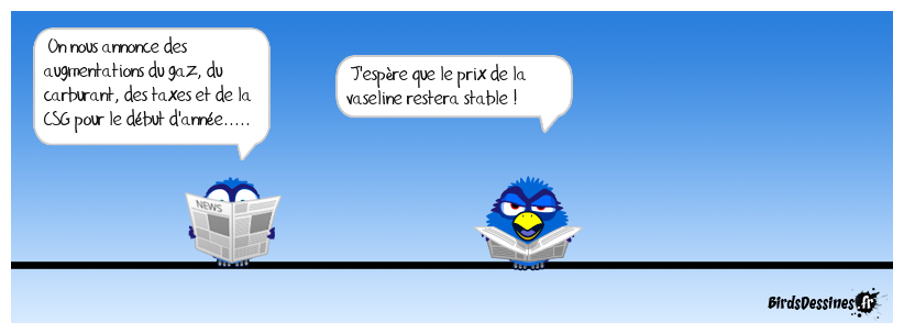 Case 1:Bird 1: On nous annonce des augmentations du gaz, du carburant, des taxes et de la CSG pour le début d'année..... | Case 2: Bird 1: J'espère que le prix de la vaseline restera stable ! | Case 3: