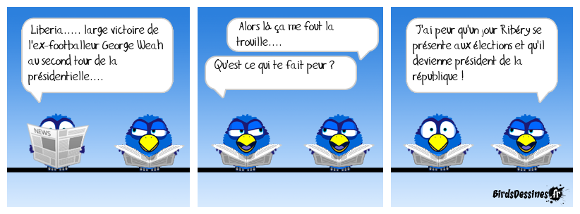 Case 1:Bird 1: Liberia..... large victoire de l'ex-footballeur George Weah au second tour de la présidentielle.... | Case 2: Bird 1: Alors là ça me fout la trouille.... Bird 2: Qu'est ce qui te fait peur ? | Case 3: Bird 1: J'ai peur qu'un jour Ribéry se présente aux élections et qu'il devienne président de la république !