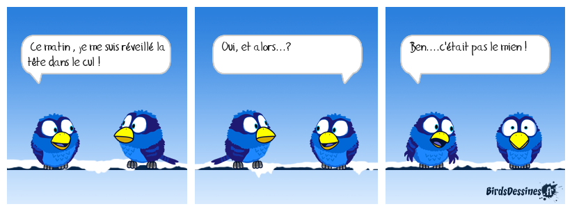 Case 1:Bird 1: Ce matin , je me suis réveillé la tête dans le cul ! | Case 2: Bird 1: Oui, et alors...? | Case 3: Bird 1: Ben....c'était pas le mien !