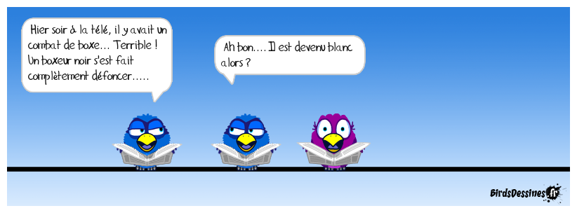 Case 1:Bird 1: Hier soir à la télé, il y avait un combat de boxe... Terrible ! Un boxeur noir s'est fait complètement défoncer..... | Case 2: Bird 1: Ah bon.... Il est devenu blanc alors ? | Case 3: