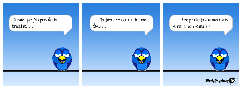 Case 1:Bird 1: Depuis que j'ai pris de la brioche...... | Case 2: Bird 1: ... Ma bite est comme le bon dieu..... | Case 3: Bird 1: .... J'en parle beaucoup mais je ne la vois jamais !