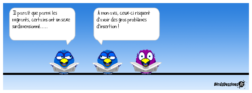 Case 1:Bird 1: Il paraît que parmi les migrants, certains ont un sexe surdimensionné..... | Case 2: Bird 1: À mon avis, ceux-ci risquent d'avoir des gros problèmes d'insertion ! | Case 3: