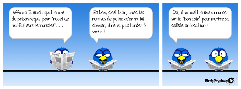 Case 1:Bird 1: Affaire Jawad : quatre ans de prison requis pour "recel de malfaiteurs terroristes"..... | Case 2: Bird 1: Eh ben, c'est bien, avec les remises de peine qu'on va lui donner, il ne va pas tarder à sortir ! | Case 3: Bird 1: Oui, il va mettre une annonce sur le "bon coin" pour mettre sa cellule en location !