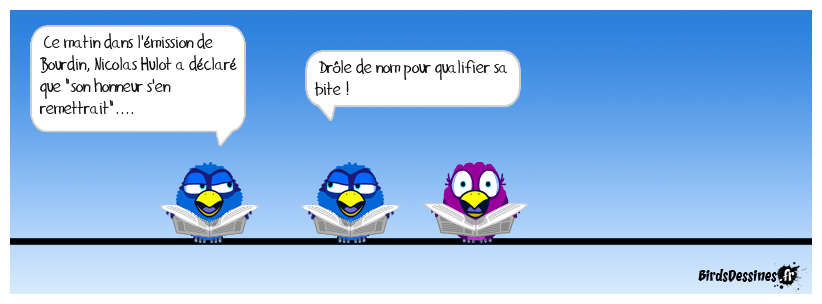 Case 1:Bird 1: Ce matin dans l'émission de Bourdin, Nicolas Hulot a déclaré que "son honneur s'en remettrait".... | Case 2: Bird 1: Drôle de nom pour qualifier sa bite ! | Case 3: