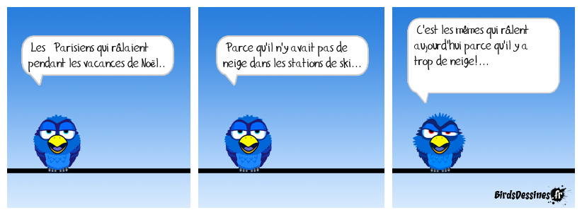 Case 1:Bird 1: Les Parisiens qui râlaient pendant les vacances de Noël.. | Case 2: Bird 1: Parce qu'il n'y avait pas de neige dans les stations de ski... | Case 3: Bird 1: C'est les mêmes qui râlent aujourd'hui parce qu'il y a trop de neige!...