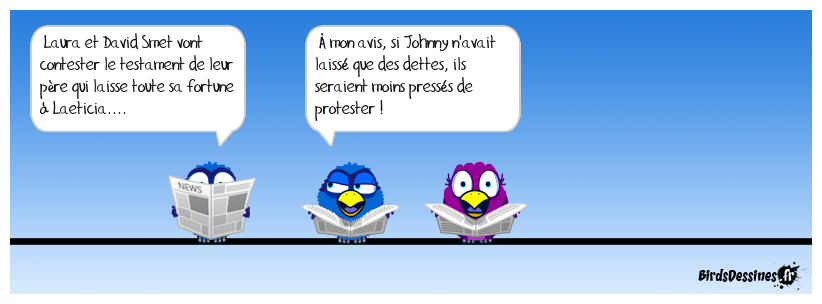 Case 1:Bird 1: Laura et David Smet vont contester le testament de leur père qui laisse toute sa fortune à Laeticia.... | Case 2: Bird 1: À mon avis, si Johnny n'avait laissé que des dettes, ils seraient moins pressés de protester ! | Case 3: