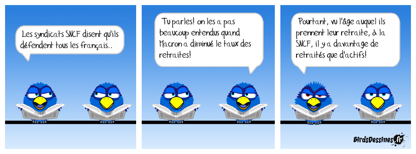 Case 1:Bird 1: Les syndicats SNCF disent qu'ils défendent tous les français.. | Case 2: Bird 1: Tu parles! on les a pas beaucoup entendus quand Macron a diminué le taux des retraites! | Case 3: Bird 1: Pourtant, vu l'âge auquel ils prennent leur retraite, à la SNCF, il y a davantage de retraités que d'actifs!