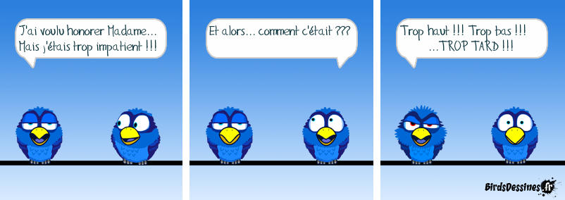 Case 1:Bird 1: J'ai voulu honorer Madame... Mais j'étais trop impatient !!! Case 2:Bird 1: Et alors... comment c'était ??? Case 3:Bird 1: Trop haut !!! Trop bas !!! ...TROP TARD !!!