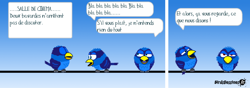 Case 1:Bird 1: .....SALLE DE CINEMA...... Deux bavardes n’arrêtent pas de discuter. Case 2:Bird 1: Bla bla bla bla bla Bla bla bla bla bla......Bird 2: S’il vous plait, je n’entends rien du tout Case 3:Bird 1: Et alors, ça vous regarde, ce que nous disons !
