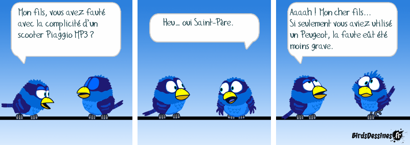 Case 1:Bird 1: Mon fils, vous avez fauté avec la complicité d’un scooter Piaggio MP3 ? Case 2:Bird 1: Heu… oui Saint-Père. Case 3:Bird 1: Aaaah ! Mon cher fils... Si seulement vous aviez utilisé un Peugeot, la faute eût été moins grave.