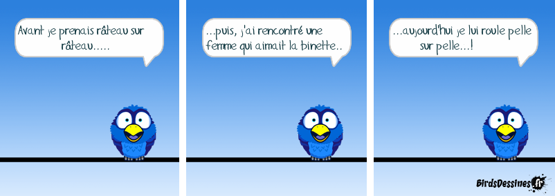 Case 1:Bird 1: Avant je prenais râteau sur râteau..... Case 2:Bird 1: ...puis, j'ai rencontré une femme qui aimait la binette.. Case 3:Bird 1: ...aujourd'hui je lui roule pelle sur pelle...!