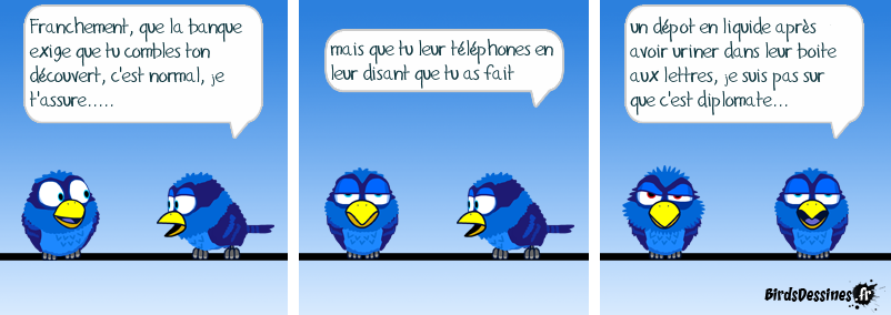 Case 1:Bird 1: Franchement, que la banque exige que tu combles ton découvert, c'est normal, je t'assure..... Case 2:Bird 1: mais que tu leur téléphones en leur disant que tu as fait Case 3:Bird 1: un dépot en liquide après avoir uriner dans leur boite aux lettres, je suis pas sur que c'est diplomate...