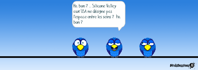 Case 1: Case 2:Bird 1: Ha bon ? .. Silicone Valley aux USA ne désigne pas l'espace entre les seins ? ha bon ? Case 3: